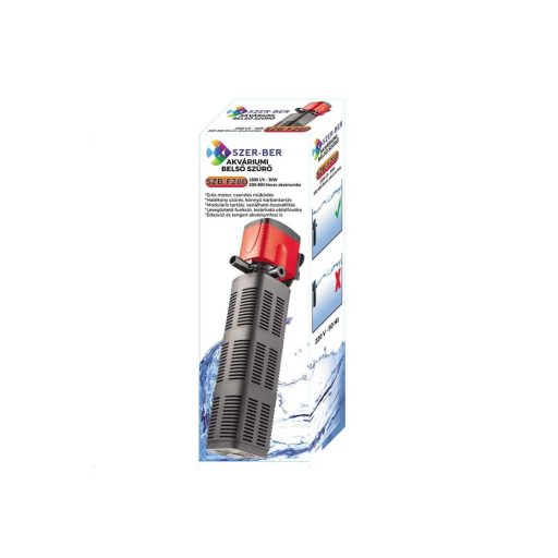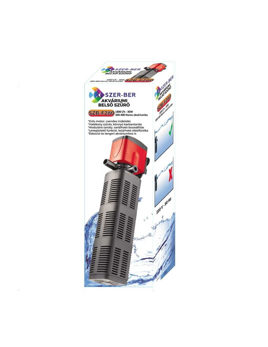 SZER-BER SZB-F280 akváriumi belső szűrő. Nagy vízforgató teljesítménnyel bíró, hatékony akváriumszűrő. Nagy szűrőkapacitása a moduláris szűrőtartálynak köszönhetően igény szerint tovább bővíthető, több szűrőrekesz használata esetén különböző szűrőanyagok is kombinálhatók. Kezelése és karbantartása egyszerű, a szűrőanyag-csere könnyen elvégezhető. Dupla fúvókás kivitelezése extra funkciókat is elérhetővé tesz: elülső fúvókája a megszokott vízáramlást mellett a csomagban foglalt levegőcső használata által az akvárium oxigénellátásához is hozzájárulhat. Az oldalsó fúvóka lehetőséget ad a vízáramlás elosztására, vagy egy tömlőt ráhúzva a szűrt víz egy részét szükség esetén elvezethetjük; az oldalsó fúvóka a csomagban mellékelt dugóval lezárható. Durva szűrőszivacsa ideális mechanikai szűrést biztosít, és a szűrőbaktériumok megtelepedését is segíti. Motorja erős vízforgatást produkál, csendes és megbízható.