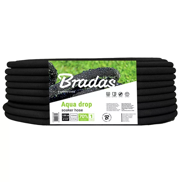 AQUA-DROP - ÁZTATÓCSŐ - rugalmas és tartós, 100%-ban újrahasznosított, kiváló minőségű gumiból készült, amely teljes hosszában vízáteresztést tesz lehetővé. Akár 70%-os vízmegtakarítást biztosít. A beépített szabványos gyorscsatlakozó adapterek gyors és egyszerű csatlakoztatást tesznek lehetővé a kerti tömlővel. Legfeljebb 20 cm mélységben kéreggel borítható vagy föld alá temethető. Ideális a precíz és hatékony növényöntözéshez.