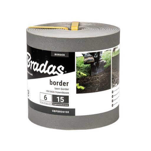 Szürke, műanyag gyep- és ágyásszegély mely alkalmas a gyep, növények, utak, parkok és kertek határának elszigetelésére.