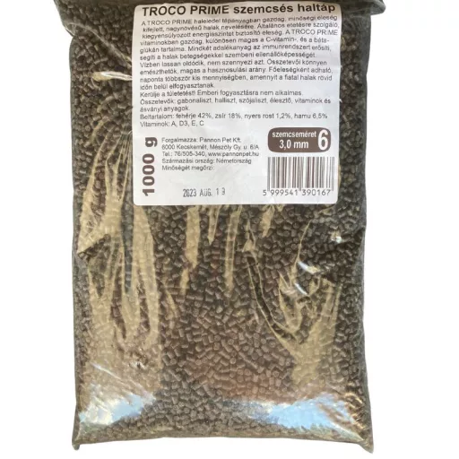 A Coppens Troco Prime süllyedő haleledel tápanyagban gazdag, minőségi eleség kifejlett, nagynövésű halak számára. Általános etetésre szolgáló, kiegyensúlyozott energiaszintet biztosító eleség. Vitaminokban gazdag, különösen magas a C-vitamin, és a béta-glükán tartalma. Mindkét adalékanyag az immunrendszert erősíti, segíti a halak betegségekkel szembeni ellenállóképességét. Vízben lassan oldódik, nem szennyezi azt. Összetevői könnyen emészthetők, magas a hasznosulási arány. Főeleségként adható, naponta többször kis mennyiségben, amennyit a halak rövid időn belül elfogyasztanak. Szemcseméret: 3mm.