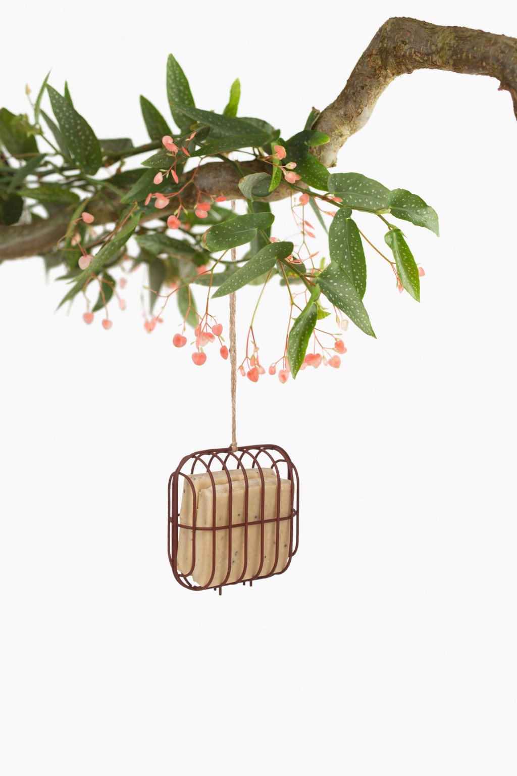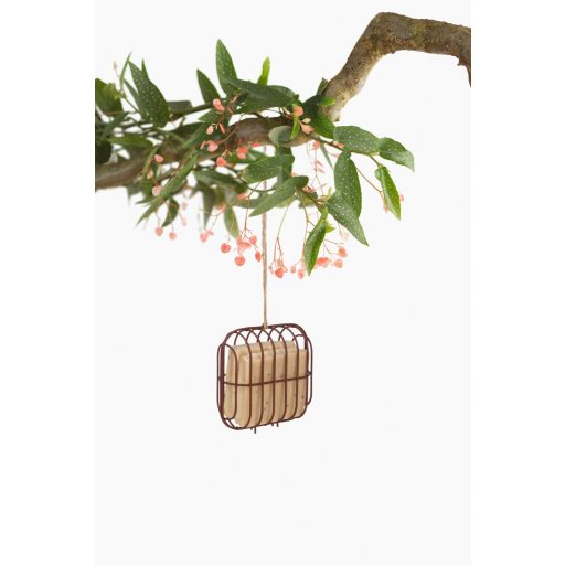 A tartó újrahasznosított szálalapú anyagból készült, amely könnyű, mégis kellően tartós a kültéri használathoz. A rugalmas, átszellőző szerkezet lehetővé teszi, hogy a faggyúkockákhoz a madarak könnyen hozzáférjenek, miközben az eleség stabilan a helyén marad.