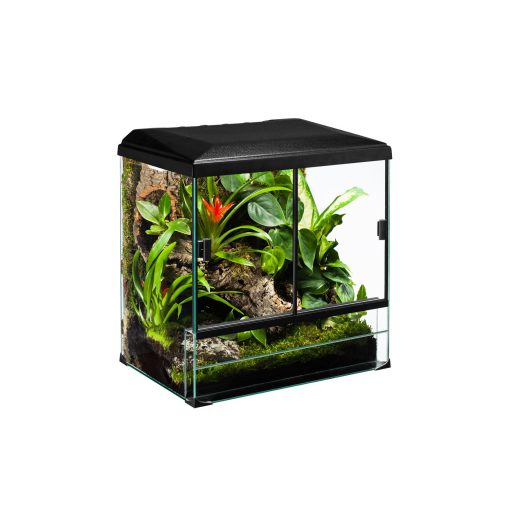 Diversa Terraset Forest terrárium szett komplett felszereléssel. Mérsékelt éghajlati, és nedves trópusi erdőkből származó kétéltűek és hüllők tartásához ideális. Magasított üveg terrárium tolóajtóval, kivezetőnyílással az elektromos vezetékek számára, dupla szellőzőráccsal a megfelelő szellőzéshez. A magas beltér kifejezetten ideális magas függőlegesen közlekedő állatoknak, mint pl. kaméleonok. Műanyag tető 1db 11W-os E27 izzóval. A készlet tartalmaz etető- és itatótálat, műszikla búvóhelyet-kilépőt, hőmérőt. Teljes méretei 30*25*35cm.
