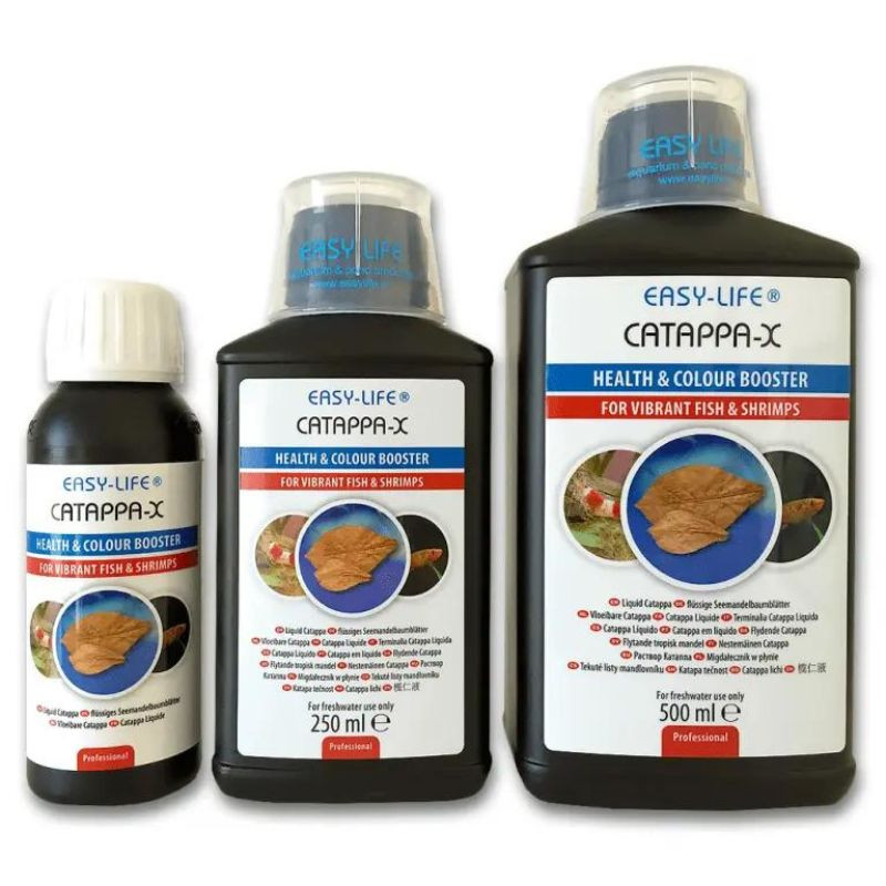 A Catappa-X a válasz ezekre a problémákra. Nem színezi el és nem szennyezi a vizet, valamint csökkenti a káros baktériumok számát, ami nagymértékben mérsékli a betegségek kialakulásának esélyét. A Catappa-X használata a halak és garnélák színét is élénkebbé teszi.