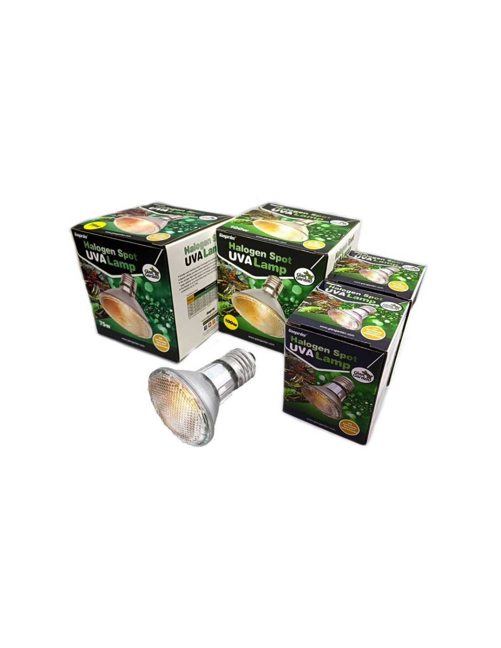 Giangarden Halogen Spot UVA terráriumi halogén izzó. Nagy erejű, koncentrált fénysugarat bocsájt ki, amely ideális napozóterületet hoz létre hüllőnk számára. Erős, egyenletes fénye a nap fényéhez hasonlít. Beépített reflektora által fényereje a hagyományos izzókéhoz képest intenzívebb, és nagyobb hatótávolsággal bír. Az UVA sugárzás fontos a hüllők színlátásához, valamint hozzájárul a jobb közérzethez, emésztéshez, és serkenti az aktivitást. A hagyományos izzókhoz képest akár 15%-kal kevesebb energiát igényel, és akár 3-szor tartósabb, emellett a párás környezetet is jobban tűri. Szabványos E27 izzófoglalatban használható, nem igényel speciális előtétet.
