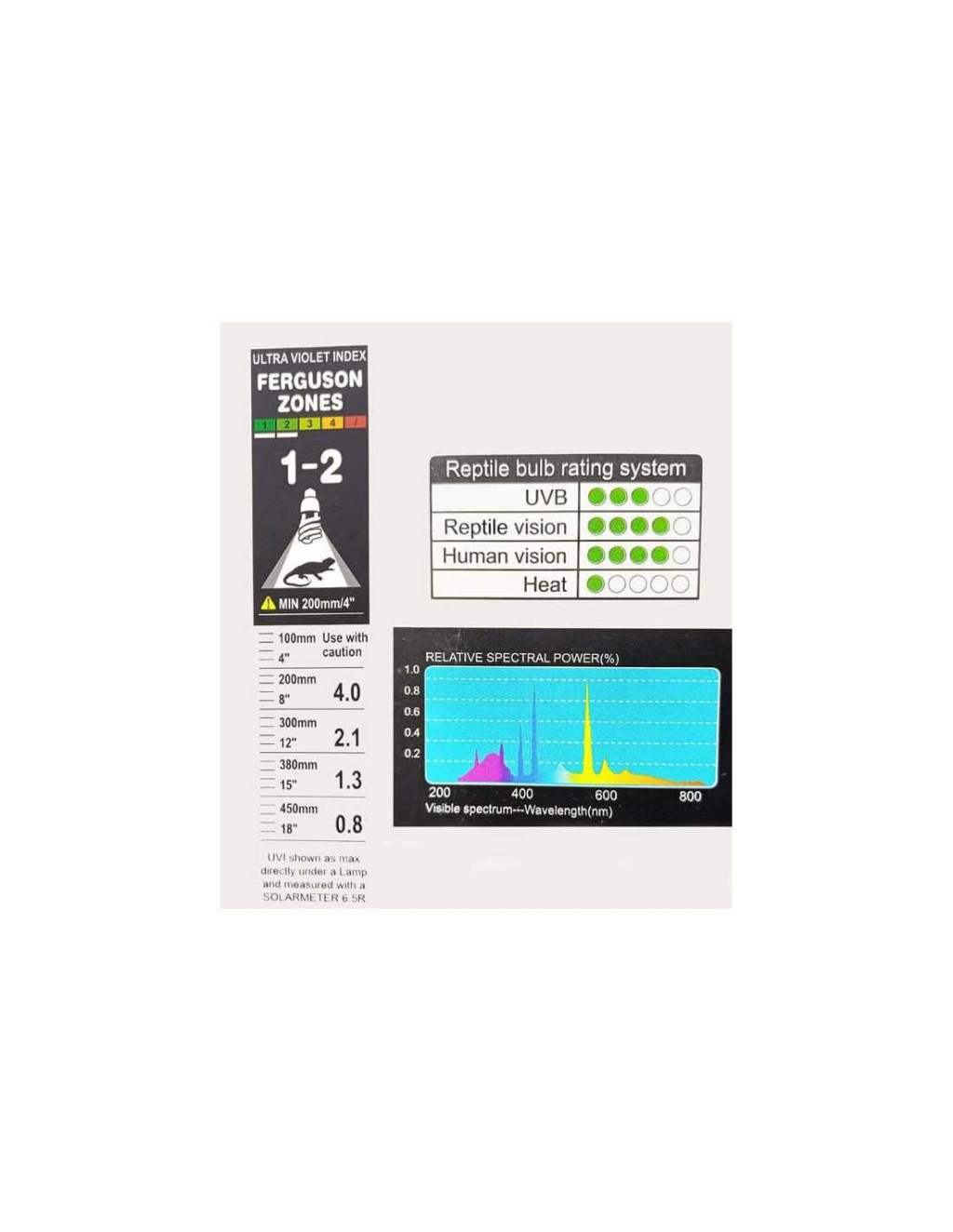 Giangarden Fluorescent Lamp UVB terráriumi kompakt izzó. Látható fényt, UVA és magas UVB sugárzást biztosító, alacsony hőkibocsájtású izzó. A 290-310 nm hullámhosszú UVB sugárzás stimulálja a D3-vitamin szintézist, ami hozzájárul a hatékonyabb kalcium feldolgozáshoz, így terráriumi állataink csontozata és páncélzata egészségesen fejlődhet és meg is őrizheti egészségét. Eközben az UVA sugárzás hozzájárul a jobb közérzethez és emésztéshez, serkenti az aktivitást és szaporodási kedvet. Az UVB 5.0 változat a trópusi és szubtrópusi esőerdőkben honos állatfajokhoz ideális, hatékonysága 30-40cm távolságig ér, UVB 5% - UVA 30%. Szabványos E27 foglalatban üzemeltethető.