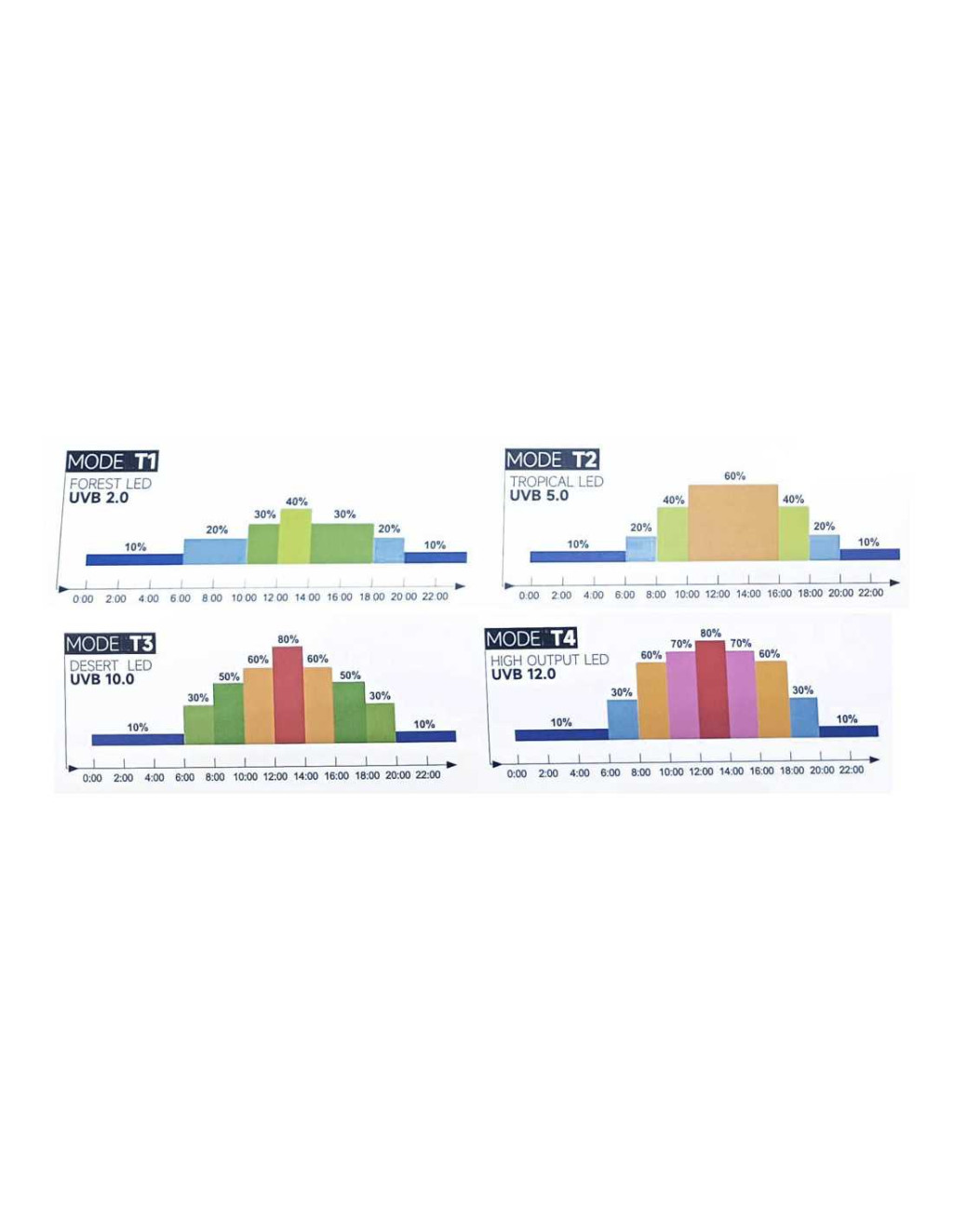 - előre programozott üzemmódok 4-féle: trópusi erdei (2.0 UVB), félsivatagi (5.0 UVB), sivatagi (10.0 UVB), intenzív fényviszonyok (12.0 UVB)