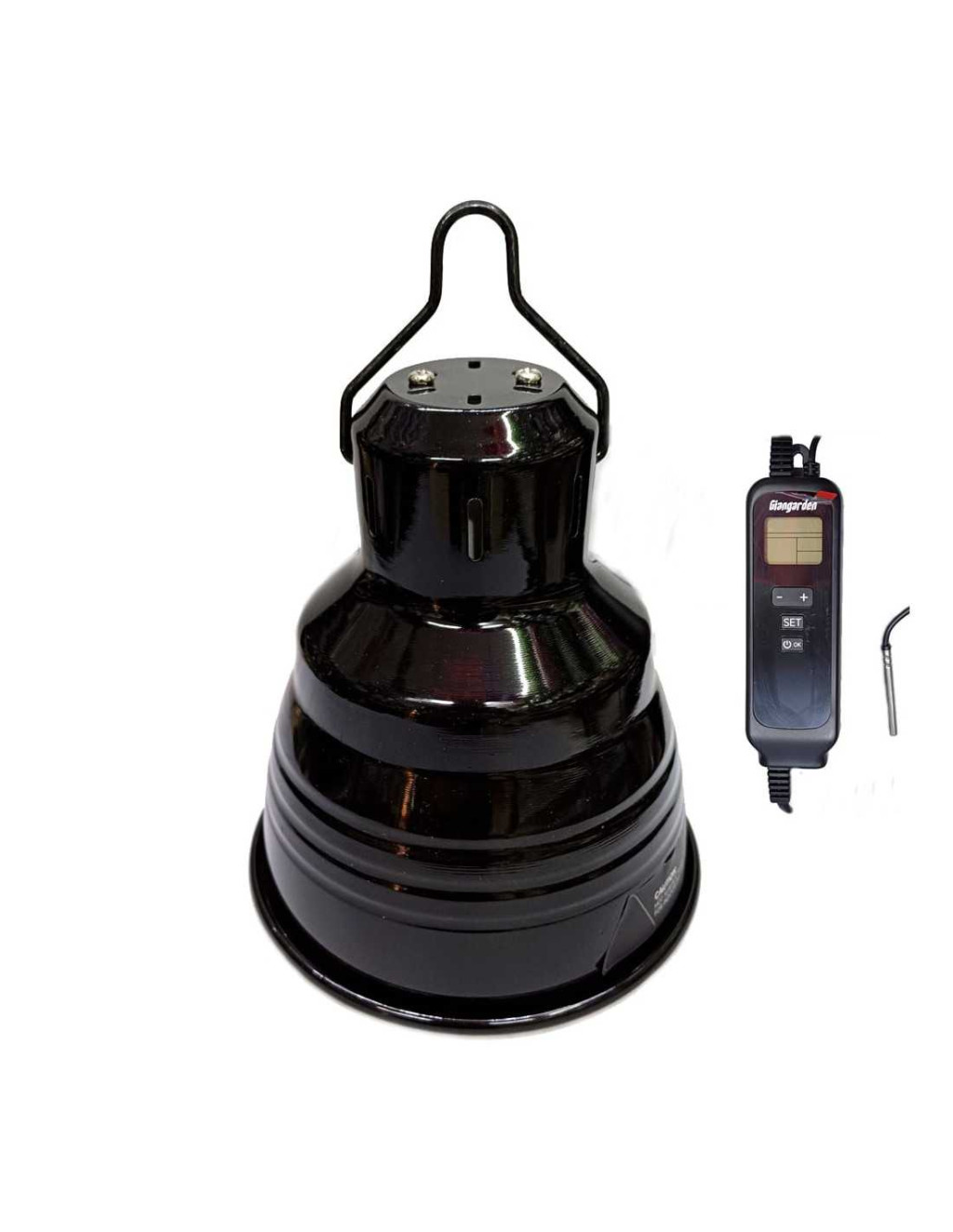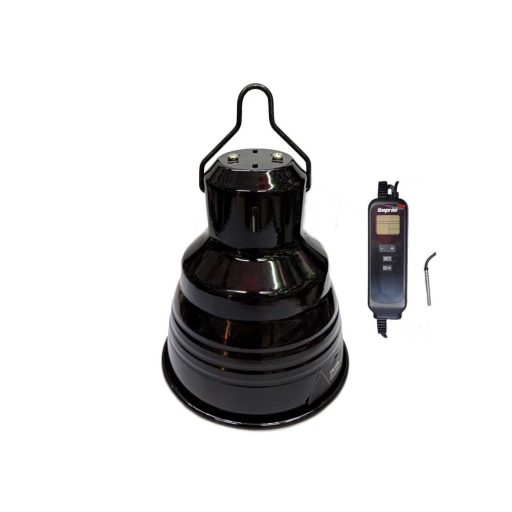Giangarden terráriumi lámpabura kerámia izzófoglalattal. Minőségi alumínium szoknyájának fényvisszaverő belseje nem csak a fényerősséget maximalizálja, de az UVB sugárzást is növeli akár 80%-kal. A kerámia foglalat ellenáll a hőhatásnak, amit a bura tetején kialakított szellőzés is csökkent. Fém akasztóval ellátott, így rugalmasabb elhelyezés biztosított. Digitális vezérlővel és hőérzékelő szondával felszerelt, így az általunk beállított időszakban a hozzá megadott hőmérséklet eléréséhez szükséges fényerővel világít. A vezeték hosszúsága 180cm. A lámpabura teljes méretei 14*15cm, a foglalat max. 100W teljesítményű E27 izzó működtetésére képes. Mindig ellenőrizd a használni tervezett izzó leírásában, hogy az alkalmas-e fényerőszabályozásra.