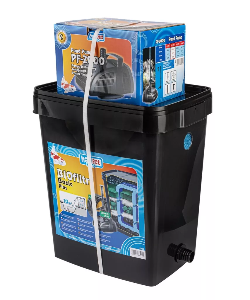 A készlet egy Happet PF-2000 vízpumpát is tartalmaz, amely biztosítja a folyamatos vízáramlást a szűrőn keresztül. Az egyszerű felépítésnek köszönhetően a szűrő maximálisan kihasználja a szűrőanyagok kapacitását, miközben karbantartása és tisztítása is könnyű. A szűrőanyagok igény szerint cserélhetők vagy variálhatók.