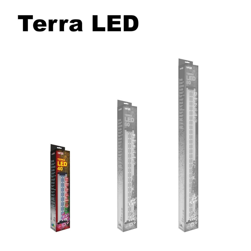 Happet TerraLED terrárium világítás. Erős fényű LED lámpatest masszív, de vékony alumínium profillal terráriumok és vivariumok megvilágítására. Hatékony LED diódái (5730) által akár 60%-kal kevesebb energiát fogyaszt a hasonló méretű, hagyományos izzóval üzemelő lámpákhozképest. Az izzók intenzív erejű (1500 lumen) fénye és 8000K színhőmérséklete a növények hatékony fotoszintézisét segíti elő, valamint kiemeli az élővilág természetes színeit. Elegáns és modern kinézetű. Állítható hosszúságú lábai stabilan tartják a lámpát a terrárium széleire helyezve. A lámpatest nem termel hőt, így bármilyen terráriumi melegítőeszközzel használható párhuzamosan.