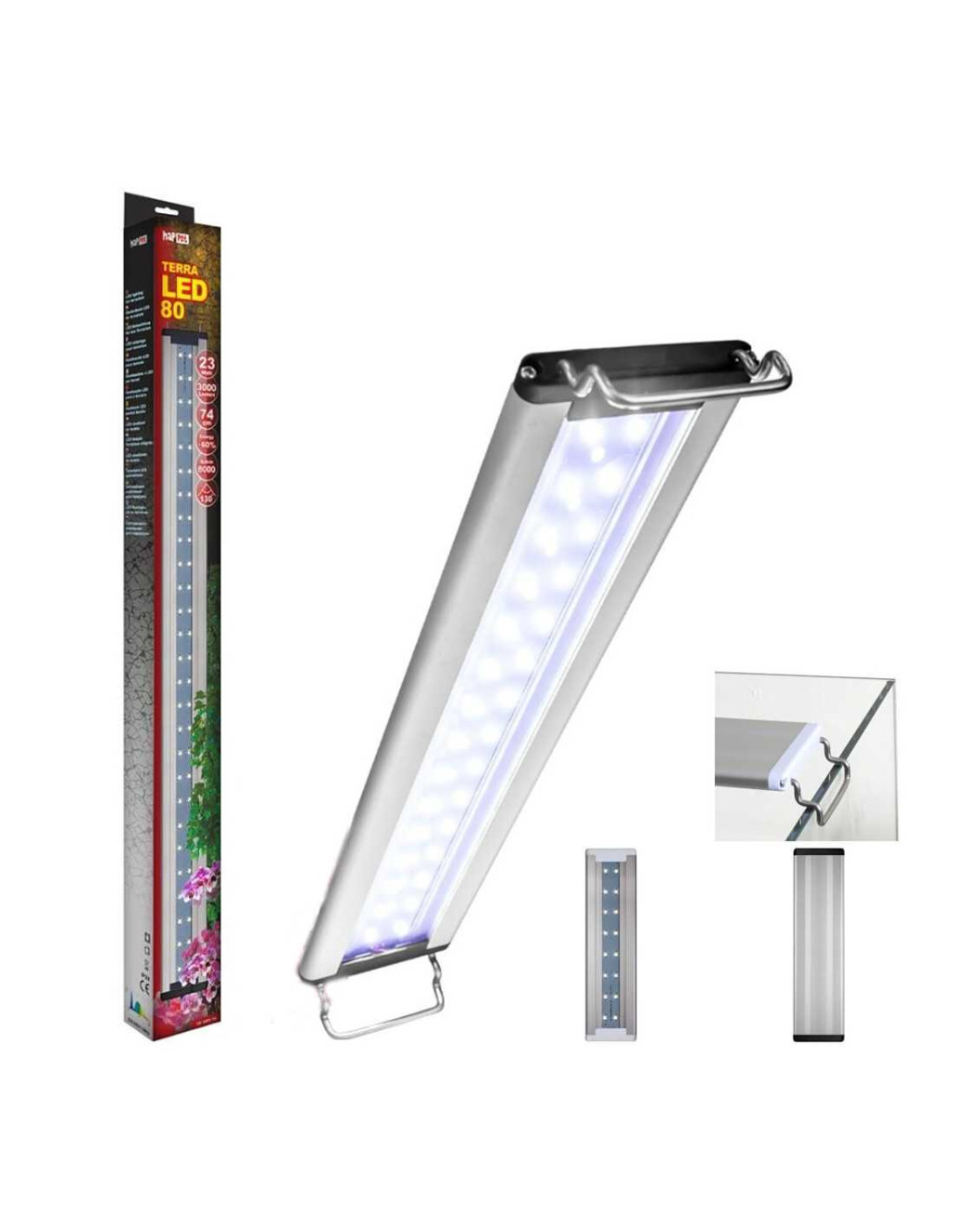 Happet TerraLED terrárium világítás. Erős fényű LED lámpatest masszív, de vékony alumínium profillal terráriumok és vivariumok megvilágítására. Hatékony LED diódái (5730) által akár 60%-kal kevesebb energiát fogyaszt a hasonló méretű, hagyományos izzóval üzemelő lámpákhozképest. Az izzók intenzív erejű (3000 lumen) fénye és 8000K színhőmérséklete a növények hatékony fotoszintézisét segíti elő, valamint kiemeli az élővilág természetes színeit. Elegáns és modern kinézetű. Állítható hosszúságú lábai stabilan tartják a lámpát a terrárium széleire helyezve. A lámpatest nem termel hőt, így bármilyen terráriumi melegítőeszközzel használható párhuzamosan.