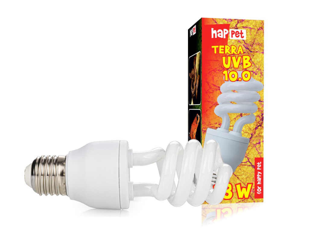 Happet UVB 10.0 energiatakarékos terrárium izzó. Spirális E27 kompakt izzó stabil hullámú UVB sugárzással. Az UVB sugárzás serkenti a D3 vitamin termelődést és kalcium felszívódást, így a hüllők csontozata egészségesen fejlődhet. A 10% UVB sugárzás a sivatagi körülményeknek felel meg, így effajta hüllőkhöz javasolt. Emellett UVA sugárzása serkenti az étvágyat, természetes viselkedést, és szaporodási kedvet.