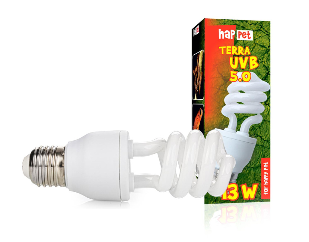 Happet UVB 5.0 energiatakarékos terrárium izzó. Spirális E27 kompakt izzó stabil hullámú UVB sugárzással. Az UVB sugárzás serkenti a D3 vitamin termelődést és kalcium felszívódást, így a hüllők csontozata egészségesen fejlődhet. Az 5% UVB sugárzás a sivatagi körülményeknek felel meg, így effajta hüllőkhöz javasolt. Emellett UVA sugárzása serkenti az étvágyat, természetes viselkedést, és szaporodási kedvet.