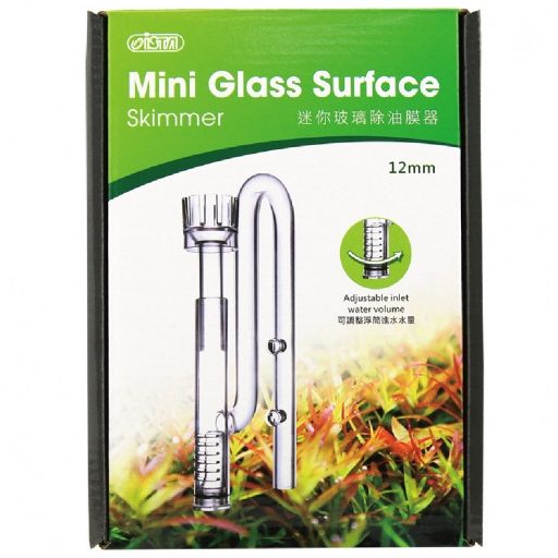 Ista Mini Glass üveg vízbeszívó pipa akváriumi külső szűrőhöz, vízfelszín szűrő (skimmer) funkcióval kiegészítve. Az üveg pipa elegáns és nagyon diszkrét kiegészítő az akvárium szűréshez. A hozzá tartozó műanyag skimmer tölcsér önállóan lebeg a víz tetején, folyamatosan alkalmazkodva a vízszinthez. A felszínszűrő eltávolítja a víz tetejéről a filmréteget és lebegő szennyeződéseket. Kompakt kialakítású kiegészítő, mindössze 12 cm teljes hosszúsággal. A víz beömlésének mértéke szabályozható. Használható 12mm belső átmérőjű (12/16mm) gumicsővel.