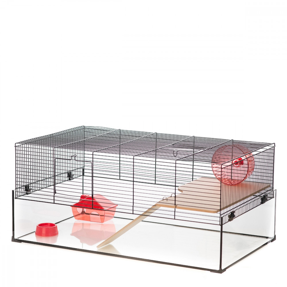 Inter-Zoo Aqualand 3 hörcsög ketrec. Különleges rágcsáló ketrec üveg aljjal, hörcsögök és kistestű rágcsálók tartásához. Az üveg tálca teljes belátást biztosít a ketrecbe, és magassága által az alom kiszórását is megakadályozza. A különleges dizájnt és felszereltséget a természetes hatású falap terasz és rámpa, valamint a műanyag házikó és futókerék, ill. etető-itató tálka teszik teljessé. Nagy alapterületű ketrec, tágas életteret és elegendő mozgási lehetőséget nyújt kiskedvenceinknek. Műanyag sarokvédők gondoskodnak az üveg éleinek védelméről.