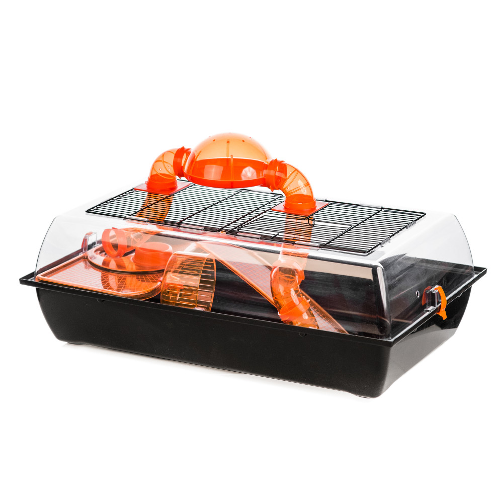 Inter-Zoo Big Alex + Terrace plexi tetős hörcsög ketrec. Szinte teljesen zárt rágcsáló ketrec, ideális hörcsög vagy más kis rágcsáló tartásához. Az átlátszó plexi fedél megakadályozza az alom kiszórását, így a ketrec környéke tiszta marad. Ráadásul teljes belátást is biztosít. Futókerék, felmászó, búvóhely és műanyag tálka gondoskodnak a maximális komfortérzetről. A ketrecből kijövő kupolás csőrendszer látványos módon növeli a mozgásteret, és külön vásárolható elemekkel tovább bővíthető. Dizájnos kialakítás, bármilyen helyiségbe jól illik. Tetején széles ajtóval a könnyű hozzáféréshez.