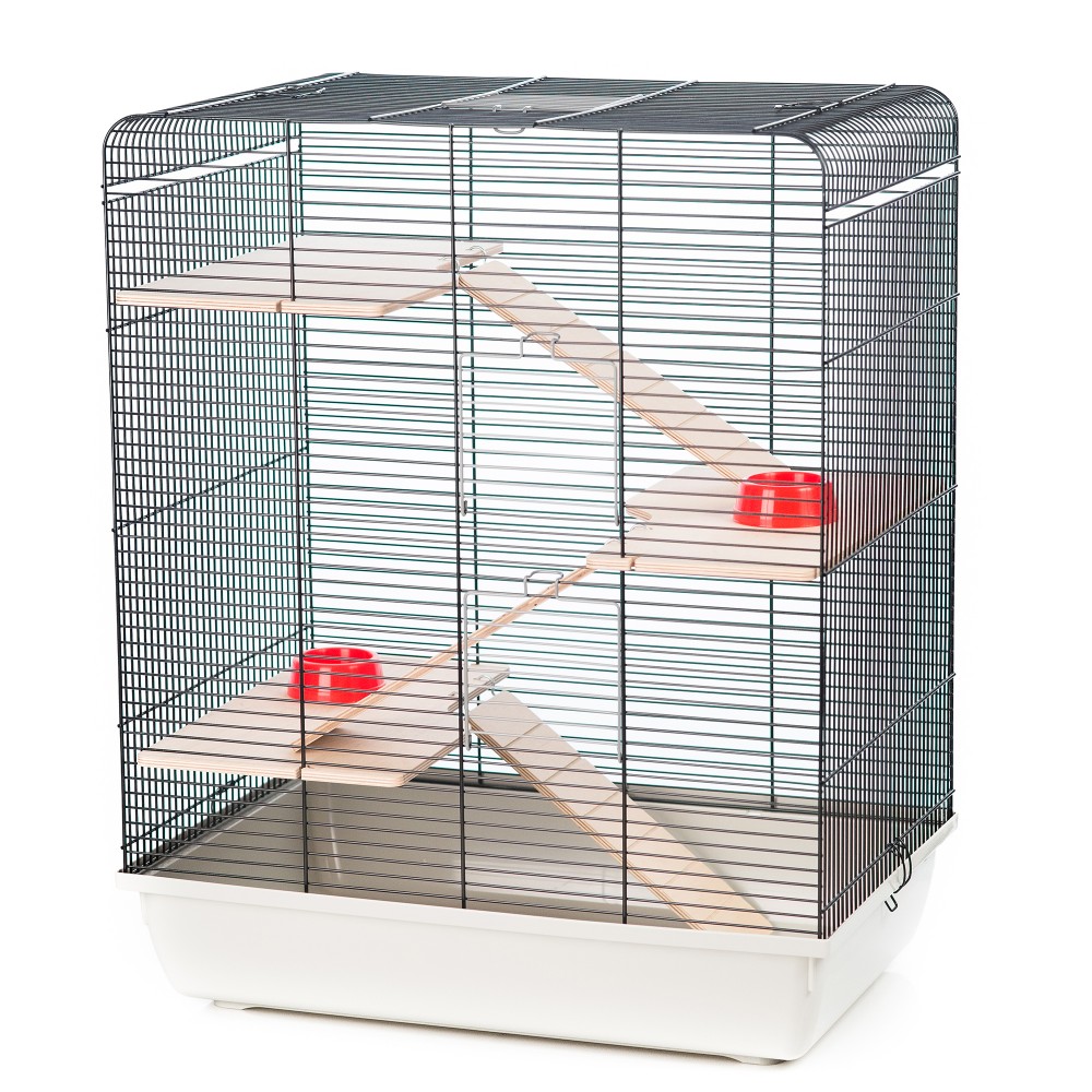 Inter-Zoo Remy Wood patkány és vadászgörény ketrec. Tágas életteret biztosító rágcsáló ketrec, elsősorban házi patkány és görény tartásához. A többszintes belső elrendezés növeli a mozgásteret. Több ajtó biztosítja a hozzáférést a kisállathoz. Masszív szerkezet.