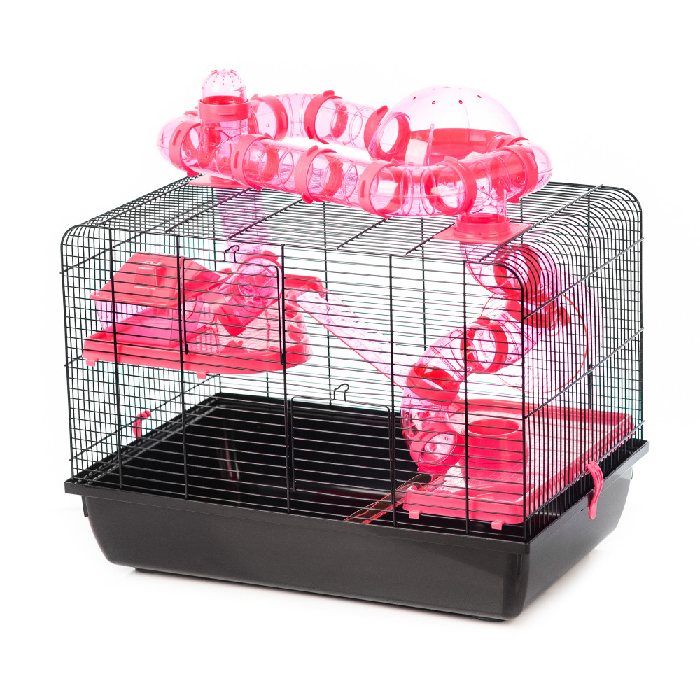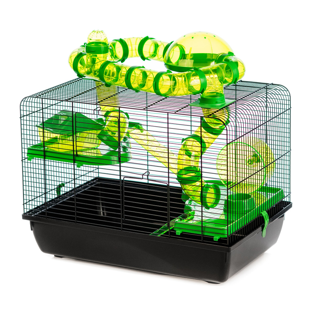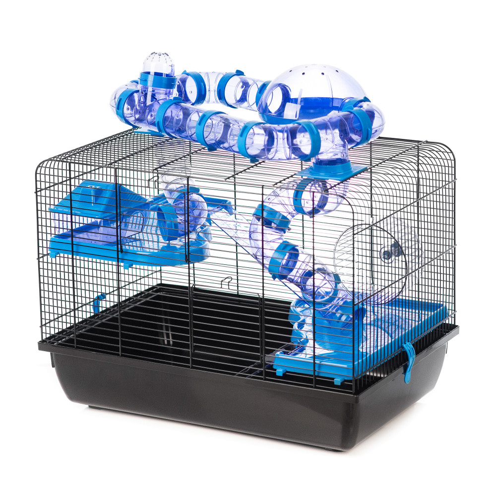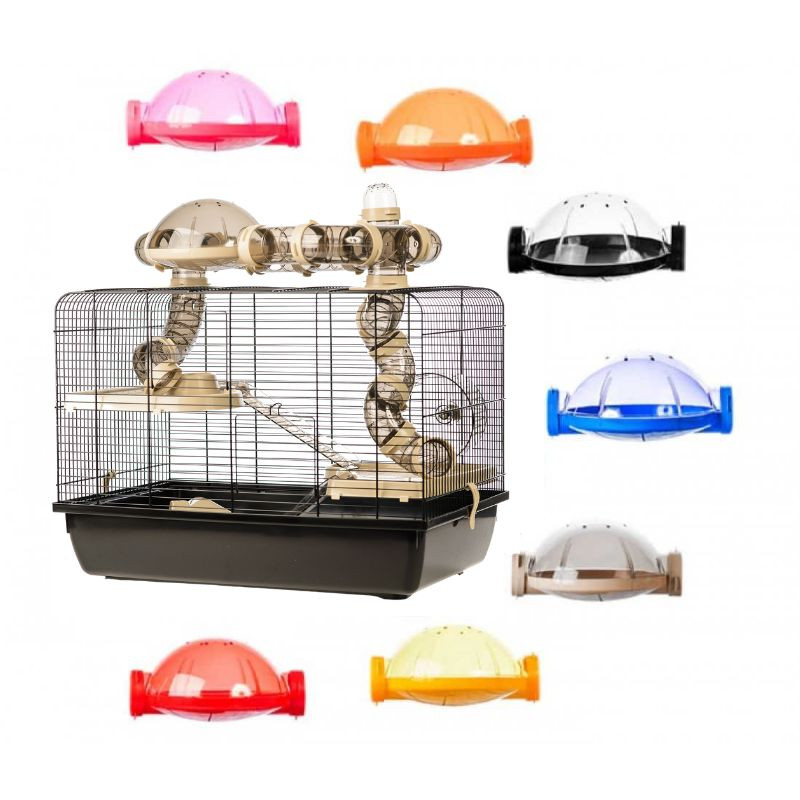 Inter-Zoo Galaxy + Terrace hörcsög ketrec. Látványos kialakítású, tágas rágcsáló ketrec hörcsögök, kis rágcsálók tartásához. Hatalmas mozgásteret biztosít a kisállatok számára. Több szintes rámpás teraszrendszere, futókereke, és külső kupolás csővezetéke maximálisan kiszolgálják a hörcsögök mozgásigényeit. A ketrecből kijövő kupolás csőrendszer látványos módon növeli a mozgásteret, és külön vásárolható elemekkel tovább bővíthető. Komfortérzetüket a műanyag házikó és etető-itató tálka növelik. Modern hatású színösszeállításai dekoratív külsőt adnak a ketrecnek.