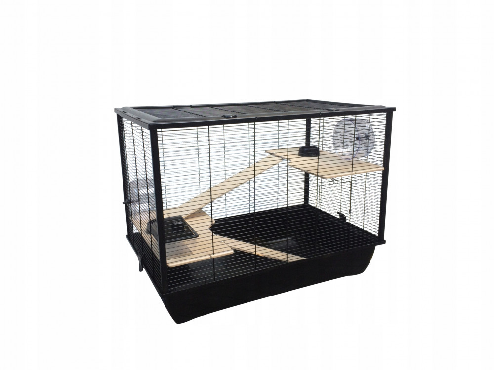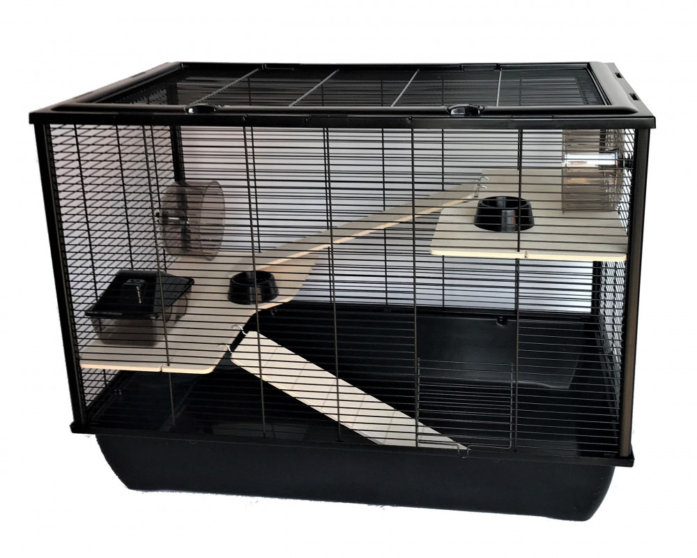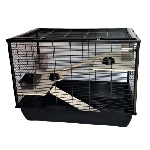 Inter-Zoo Hugo + Wood összecsukható rágcsáló ketrec. Hatalmas életteret nyújt a hörcsögök és más kis rágcsálófélék számára. Elülső ajtaján kívül a teteje teljes egészében felnyitható, így nagyon könnyen hozzáférhetünk a ketrec belsejéhez. Falemez teraszai és hozzá való feljáró rámpái maximálisan kihasználhatóvá teszik a belső teret lakói számára. A fa elemek természetes hatásukkal növelik a kis kedvencek komfortérzetét. Etető-itató tálakat, házikót és futókereket tartalmaz. Kellemes, nem rikító színösszeállítása által bármilyen helyiségbe jól illik. Az összecsukható szerkezet lényege, hogy az egyes rácsfalak különállóak, műanyag sarokelemek fogják őket össze. Szétszerelve könnyen szállítható és tárolható.