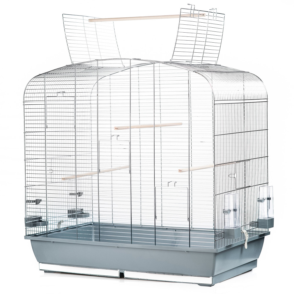 Inter-Zoo Sara Zink madárkalitka, nagy életteret biztosít kis és közepes díszmadarak tartásához. Modern külalakja és színben hozzá illő alapja kellemes látványt nyújtanak. Ülőrudakkal és etetővel/itatóval felszerelt, oldalsó ajtajára Inter-Zoo madárfürdető is illeszthető. Kivehető tálcája könnyen tisztítható. Teteje kinyitható, és a nyílásba ülőrúd helyezhető, így a madarak kiülhetnek rá.