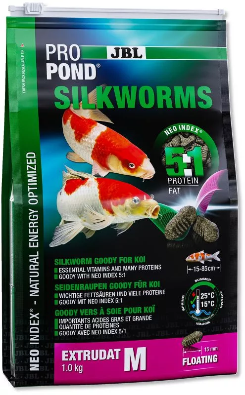 - Magas minőségű, 15 mm átmérőjű selyemhernyó formájú úszó pelletek aranyhalak és koik etetéshez 15-25 °C közötti vízhőmérséklet mellett.