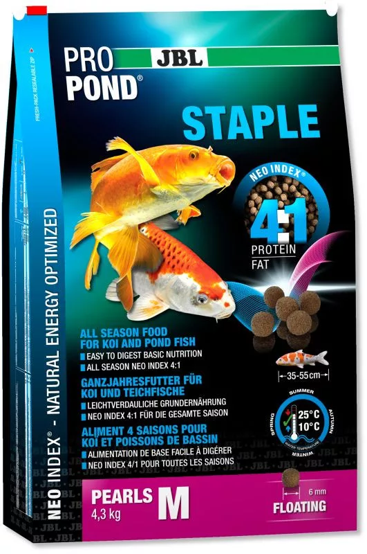 - Magas minőségű, 6 mm átmérőjű úszó pelletek aranyhalak és koik etetéshez 10-25 °C közötti vízhőmérséklet mellett.