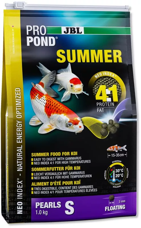 - Magas minőségű, 3 mm-es úszó golyócskák nyári etetéshez 20-30 °C közötti vízhőmérséklet mellett.