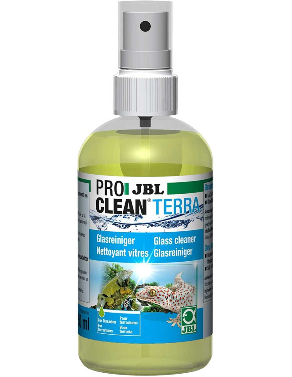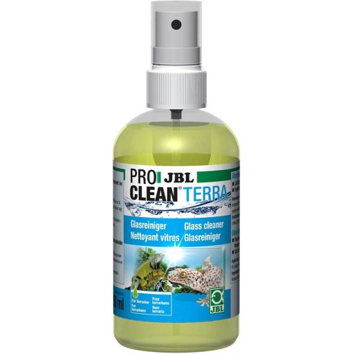 JBL ProClean Terra üvegtisztító folyadék terráriumokhoz. Természetes összetevőivel hatékonyan és biztonságosan tisztítja meg az üvegfelületet. Pumpás szórófejével könnyen használható, a makacs vízkövet is eltávolítja. Az élőlények és a növények számára nem veszélyes.