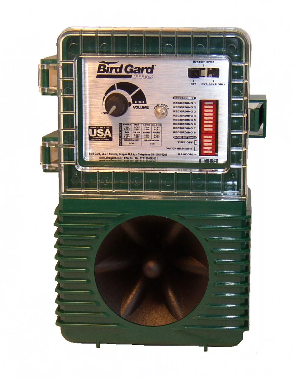Ez az eszköz madárvészhívásokat, digitálisan rögzített ragadozómadár hívásokat és elektronikus zavaró zajokat generál, hogy távol tartsa a célmadarakat a terményektől, épületektől és repülőterektől… (mindenhol, ahol a madarak problémát jelentenek).