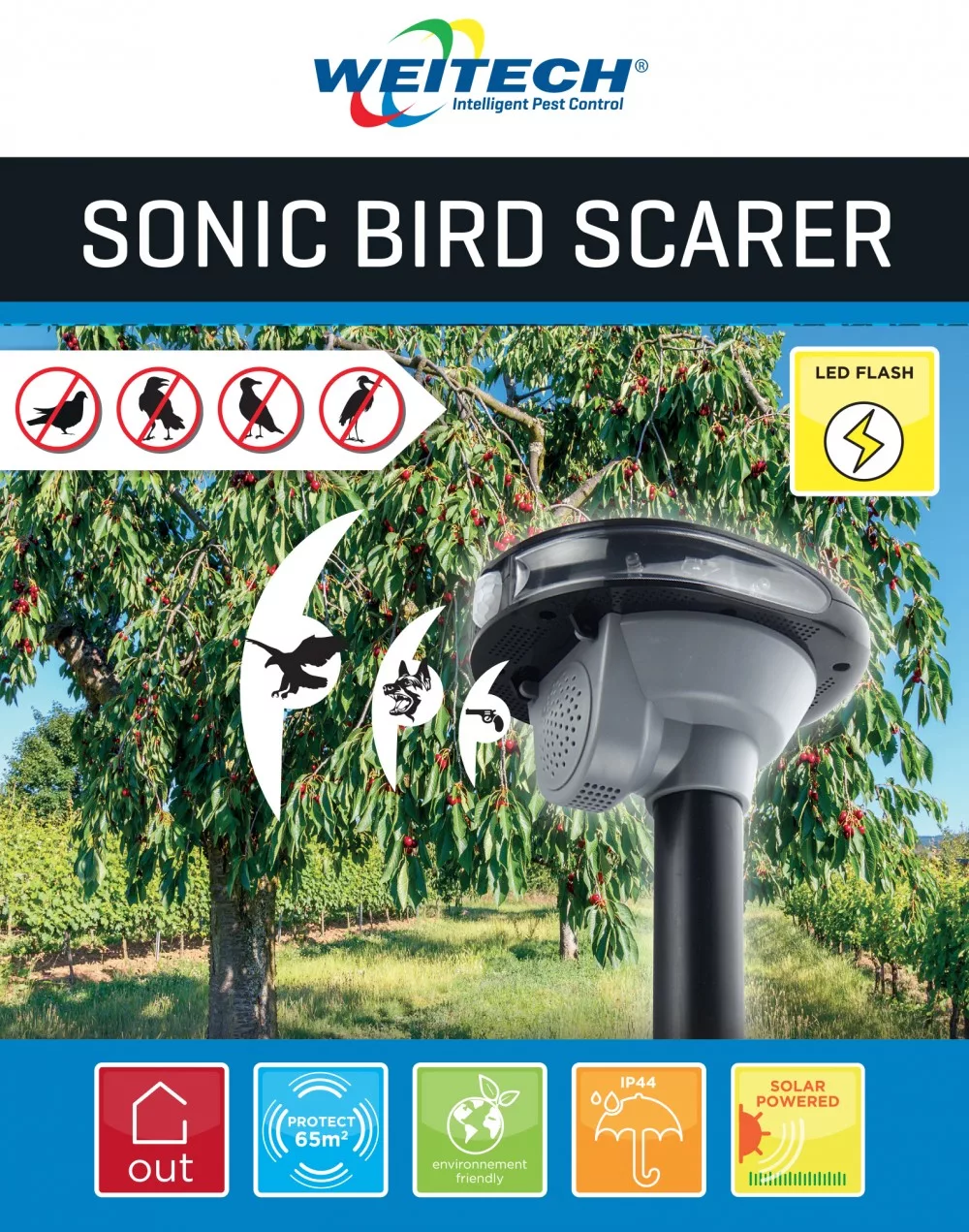 - Az eszköz infravörös LED villanásokat és erős hangokat kombinálva védi a területet a madarak kártevésétől.