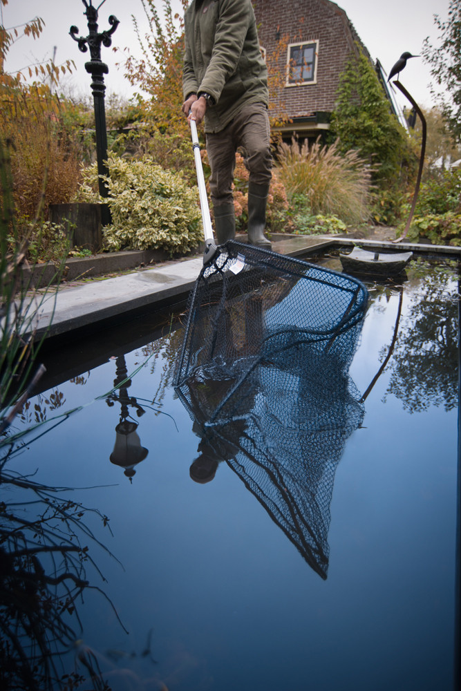 A nagy méretű, háromszög alakú merítőháló teleszkópos nyéllel kifejezetten kerti tavak rendszeres karbantartásához készült. Segítségével könnyedén eltávolíthatók a levelek, halak, valamint a nagyobb lebegő szennyeződések a vízfelszínről vagy a tóból.