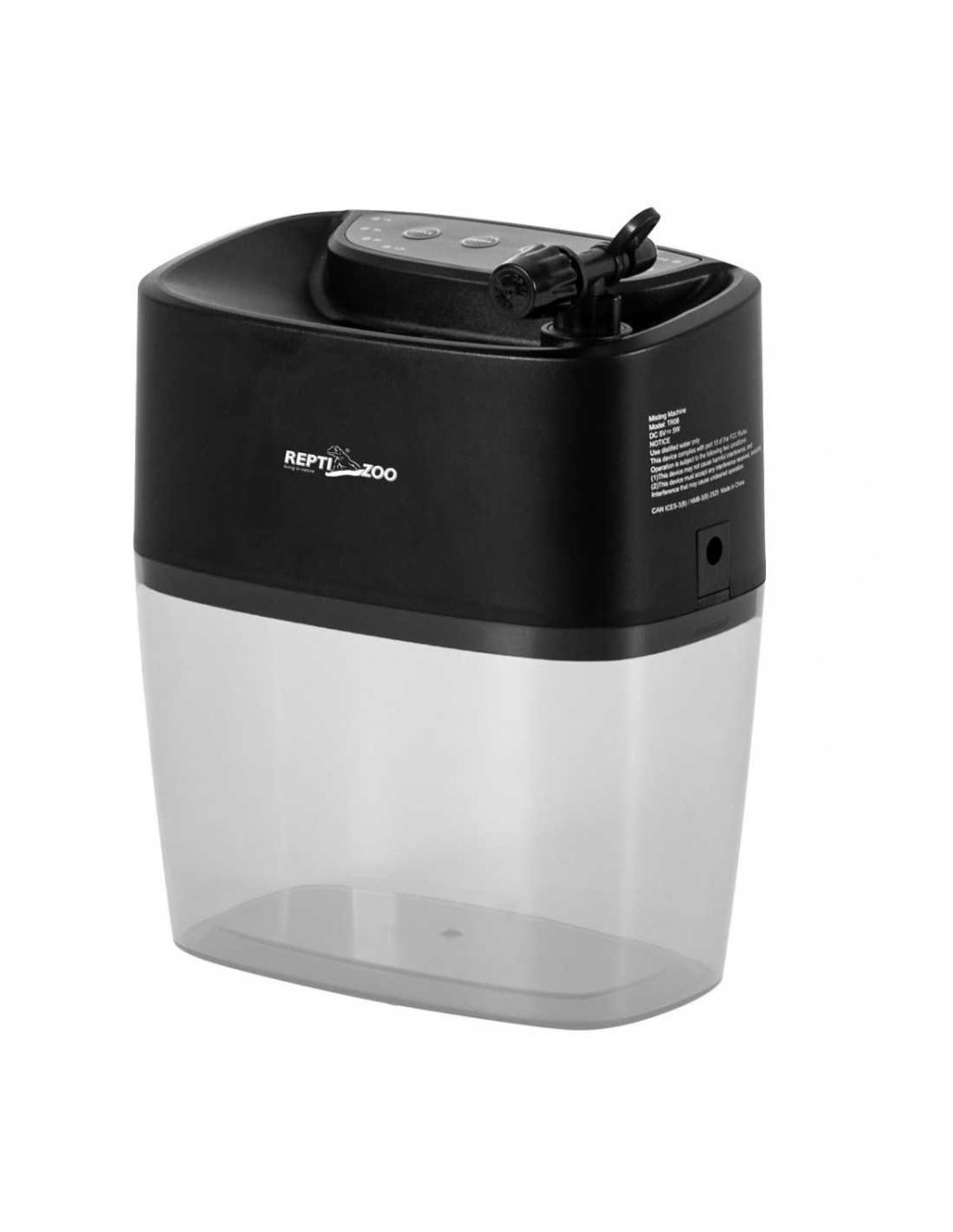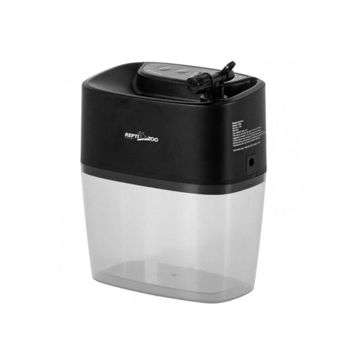 Repti-Zoo mini párásító, mely időzíthető vízpermetezéssel segít a szükségletek szerint szabályozni a terrárium páratartalmát. A kompakt méretű berendezés 800ml-es víztartállyal rendelkezik. A motort tartalmazó felső része úgy lett kialakítva, hogy azon keresztül könnyen utántölthetjük vízzel a tartályt, így nem kell minden alkalommal szétszedni a berendezést. Nyomógombok segítségével könnyen beállíthatjuk a permetezés gyakoriságát és időtartamát, mindkét paraméterre 4-4 opció áll rendelkezésre (gyakoriság 1/3/8/12 óránként, időtartam 15/30/45/60 másodperc). A készüléket a terrárium oldalán rögzíthetjük, ehhez a csomag akasztós és tapadókorongos konzolt is tartalmaz. A készüléken található vízkivezető egység egyik oldala önálló permetezőfej, míg másik oldala csőcsatlakozó, amelyen keresztül a csomagban foglalt tartozékok segítségével különálló szórófejeket csatlakoztathatunk az eszközhöz (a csomag 2db ilyen szórófejet tartalmaz). Mindennek köszönhetően a párásító a terráriumon kívül és belül is elhelyezhető. Mérete és kialakítása miatt hordozható eszköz. Beépített LED világítása a vízpermetet a permetezés idejére megvilágítja, ez a funkció is kikapcsolható. A berendezés kétféleképpen működtethető: a csomagban foglalt hálózati adapterrel, vagy 3db AA elemmel (elemeket a csomag nem tartalmaz).