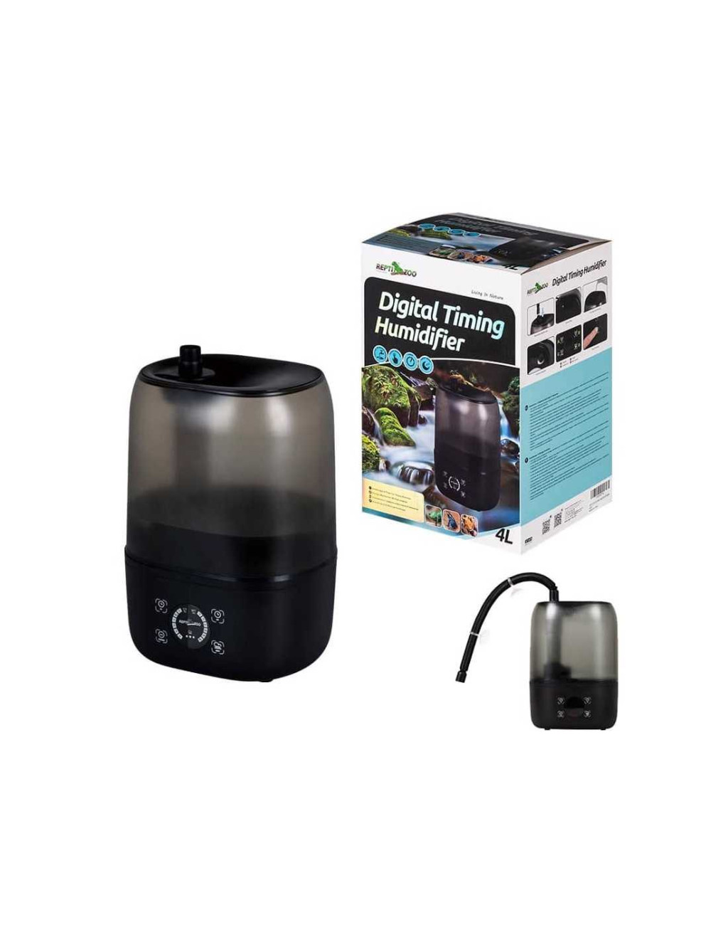 Repti-Zoo nagy kapacitású terráriumi párásító. Ultrahangos rezgéssel képez párát, hatékonyan növeli a terráriumon belüli páratartalmat. A nyomógombokkal könnyen beállítható digitális rendszerrel az igényeknek megfelelően határozhatjuk meg a párásítás gyakoriságát és időtartamát: a gyakoriságot 0,5/1/2/3/4 óránkénti időpontokra, a időtartamot pedig 2/5/10/30/60/120 perc hosszúságúra állíthatjuk be. Szabályozhatjuk a pára mennyiségét is 3 fokozatban. A készülék jelzi, ha a vízmennyiség túlságosan lecsökken, és ilyen esetben a készülék is leáll, így megelőzve az esetleges károsodásokat. A víztartályt lezáró, könnyen levehető fedél úgy lett kialakítva, hogy azon keresztül (levétele nélkül) is feltölthetjük a tartályt. Könnyen kapcsolható alvó módja az amúgy csendesen üzemelő készülék kijelzőjének fényeit lekapcsolja, hogy éjszaka azok ne zavarjanak minket. A csomag tartalmazza a pára terráriumba vezetését segítő gégecsövet, és az annak rögzítéséhez szükséges tapadókorongokat. A készülék páramérő kapcsolóval is üzemeltethető (ilyet a csomag nem tartalmaz).