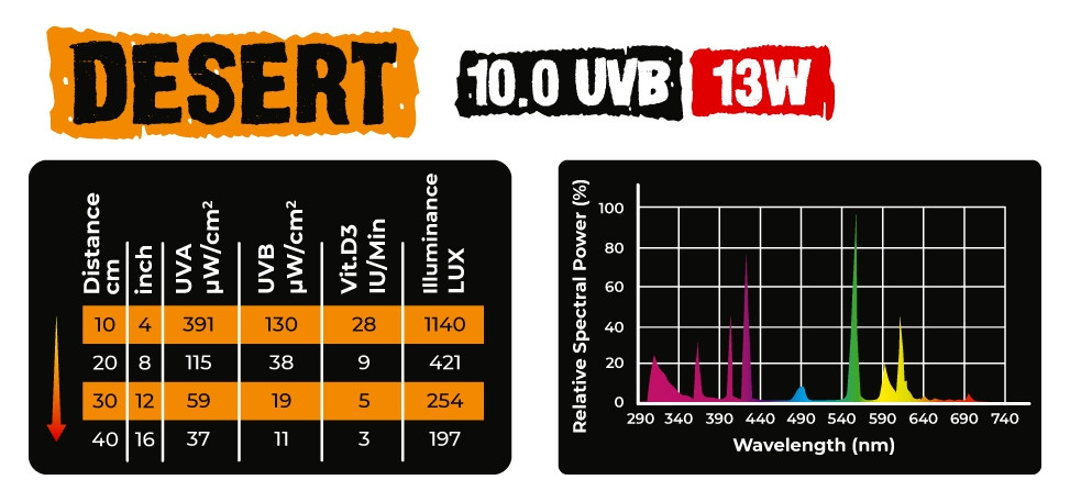 Reptile Nova Desert UVB 10.0 energiatakarékos terrárium izzó. Spirális kompakt izzó E27 foglalatba, stabil hullámú UVB sugárzással. Az UVB sugárzás serkenti a D3 vitamin termelődést és a kalcium felszívódást, így a terráriumi hüllők csontozata egészségesen fejlődhet, és az anyagcsere betegségek is megelőzhetők. Emellett UVA sugárzást is biztosít, ami serkenti az étvágyat, a természetes viselkedést, és a szaporodási kedvet. Fénye a 10%-os UVB sugárzással a félsivatagokban és sztyeppéken jellemző körülményeket imitálja, ezért az izzó félsivatagi hüllőkhöz javasolt.