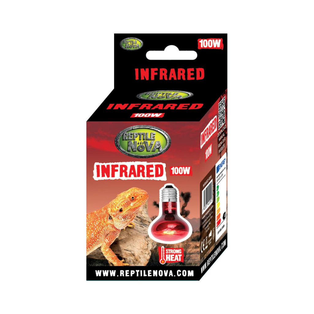 Reptile Nova Infrared terrárium izzó E27 foglalatba. Fókuszált fénye intenzív sütkérezést tesz lehetővé a terráriumi állatok számára, miközben hatékonyan növeli a környezeti hőmérsékletet. Innovatív infravörös sugárzása javítja az állatok közérzetét és színlátását. A vöröses fény nem zavarja meg a napi ciklust, így az izzó 24 órás hőforrásként használható akár más, nem melegítő fényforrásokkal párhuzamosan.