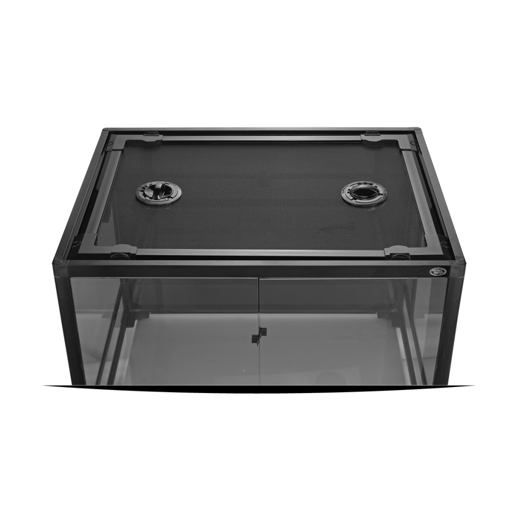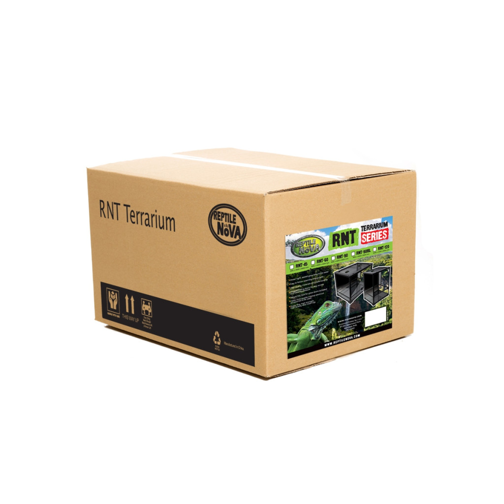 Reptile Nova RNT terrárium. Modern megoldásokkal, gondos tervezéssel készítve. Kialakítása biztosítja az ideális szellőzést, megkönnyíti a világítás kivitelezését, és a mindennapi karbantartást, gondozást. Fémhálós fedele levehető, így a terrárium tökéletesen szellőzik, és könnyen hozzáférhető a belseje. A fedlapra és oldallapra helyezett lezárható szerviznyílások az elektromos eszközök kábeleinek elvezetését könnyítik meg. A vízálló alsó rész által sokrétű berendezési lehetőség adott. Zárható tolóajtóval a még biztonságosabb használathoz. Speciális kialakítása könnyen összeilleszthető elemekből tevődik össze. Biztonságosan csomagolt, lapraszerelt állapotában a szállítása is problémamentes. Az RNT terrárium egy igazán jó alapot nyújt a terrarisztika szerelmeseinek.
