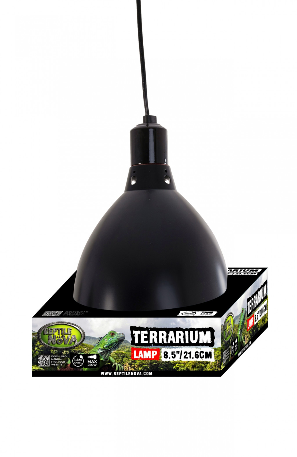 Reptile Nova terrárium világítás kerámia izzófoglalattal, és fényvisszaverő lámpaernyővel. A lámpabura belső kialakításának köszönhetően a legtöbb terrárium izzó esetében akár kétszeres intenzitású fényt, UVA/UVB sugárzást hoz létre. A kerámia izzófoglalat ellenáll a magasabb hőmérsékleteknek, így melegítő izzókkal is biztonságosan használható. A lámpabura mélysége és átmérője által a legtöbb méretű terrárium izzóval (max. 250W teljesítményig) kompatibilis. Ideális melegítő fényforrásokhoz és UVA/UVB kompakt izzókhoz. Átmérője 21cm, mélysége 18cm. Max. 250W teljesítményű, E27 foglalatú izzóval használható, elektromos vezeték 180cm hosszú, billenőkapcsolóval felszerelt. Akasztókampóval ellátott a könnyeb elhelyezéshez.