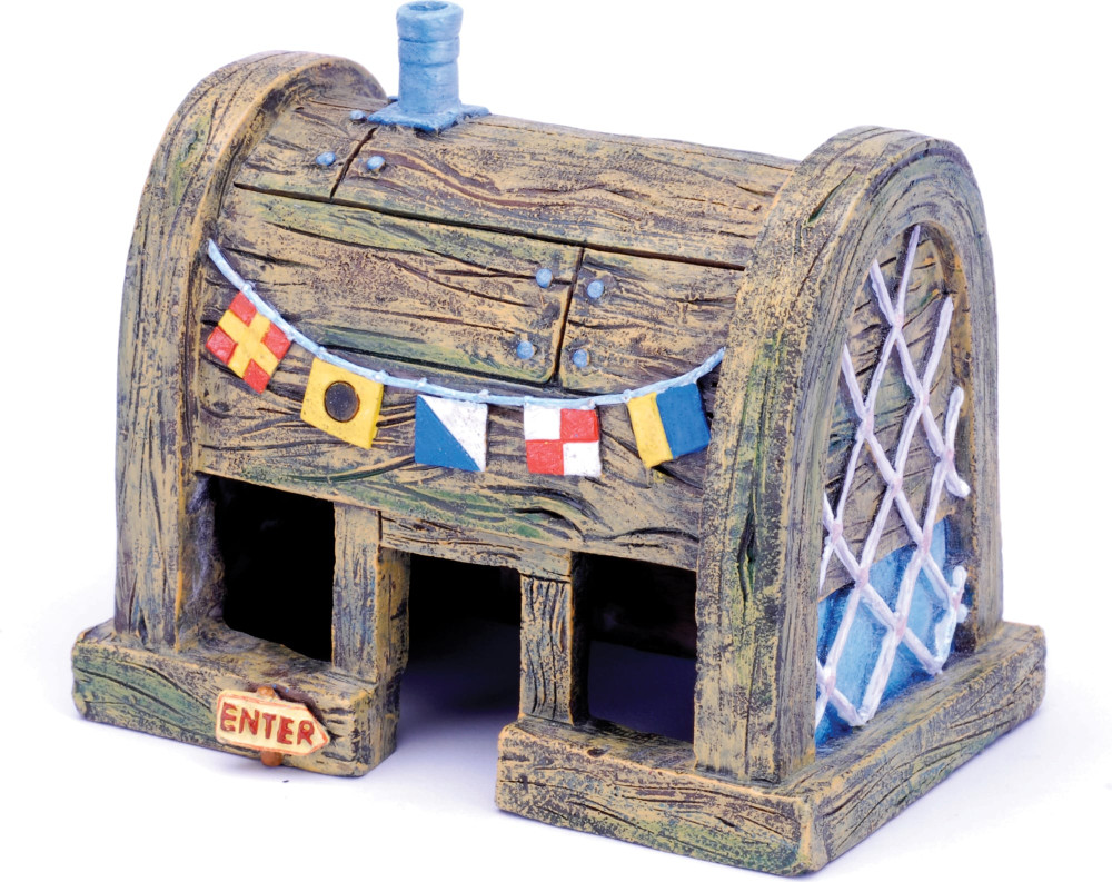 Szép kidolgozású, színes műgyanta dekoráció akváriumba. A népszerű rajzfilm-sorozat, a SpongyaBob inspirálta dísztárgy színárnyalatai és különleges kinézete igazán meseszerű látványvilágot kölcsönöz az akváriumnak, akár gyermekünk számára, akár saját örömünkre rendezzük azt be. Üreges kialakítása búvóhelyet nyújthat a kisebb talajlakó díszhalak és rákfélék számára. Akváriumon kívüli díszítésre is alkalmas, pl. terrárium dekor, szobadísz, dioráma stb.