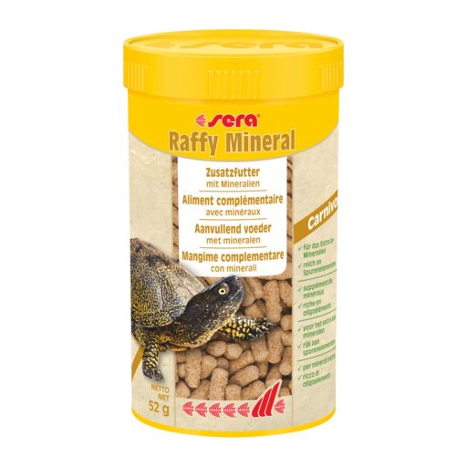 Sera Raffy Mineral hüllő eleség hüllő eleség ragadozó hüllők etetéséhez. Gondosan előállított lebegő pálcikákból álló kiegészítő táplálék húsevő hüllők, például mocsári teknősök számára. Rengeteg nélkülözhetetlen ásványi anyagot, vitamint és nyomelemet tartalmaz. Segít megelőzni olyan a hiánybetegségeket, amelyek bizonyos friss gyakran előfordulhatnak, ha csak bizonyos friss eleségekkel etetjük állatunkat. Támogatja az egészséges fejlődés, a megfelelő csont- és páncélnövekedést, valamint növeli az élénkséget és a betegségekkel szembeni ellenálló képességet. Kiszerelés 250 ml, nettó 55 g.