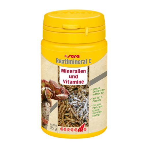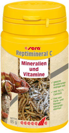 Sera Reptimineral C por alapú, koncentrált ásványianyag- és vitaminkeverékből álló kiegészítő táplálék húsevő hüllők számára. Könnyen adagolható, és kiválóan tapad élő táplálékhoz, például rovarokhoz. Az esszenciális ásványi anyagok (ebből 13% kalcium), nyomelemek, vitaminok és aminosavak kiegyensúlyozott mennyisége irányítottan javítja a friss élelmiszerek minőségét, és így biztonságosan megelőzi a táplálkozási eredetű hiánybetegségeket. Támogatja az optimális fejlődést, a betegségekkel szembeni ellenállást és a problémamentes vedlést. Kiszerelés 100ml.