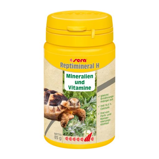 Sera Reptimineral H por alapú, koncentrált ásványianyag- és vitaminkeverékből álló kiegészítő táplálék növényevő hüllők számára. Könnyen adagolható, és kiválóan tapad friss élelmiszerekhez, például salátához. Az esszenciális ásványi anyagok (köztük 14,5% kalcium), nyomelemek, vitaminok és aminosavak kiegyensúlyozott mennyisége irányítottan javítja a friss élelmiszerek minőségét, és így biztonságosan megelőzi a táplálkozási eredetű hiánybetegségeket. Támogatja az optimális fejlődést, a betegségekkel szembeni ellenállást és a problémamentes vedlést.