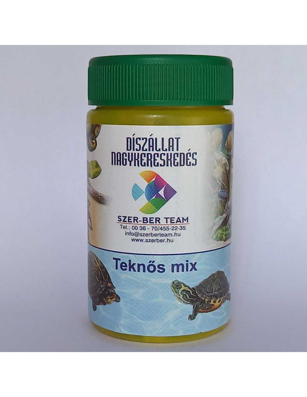 Szer-Ber Teknős Mix tápkeverék teknősöknek. Természetes és mesterséges tápok keveréke, mely ideális vízi teknősök etetésére. A tüskés bolharák (gammarus) és édesvízi garnéla mellett komplex összetételű extrudált tápot tartalmaz. Biztosítja a szükséges vitaminokat és ásványi anyagokat a teknős páncéljának megfelelő fejlődéséhez. Kiszerelés 150ml.