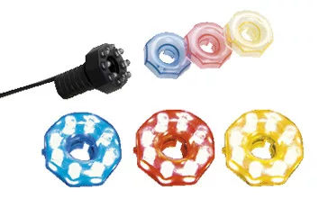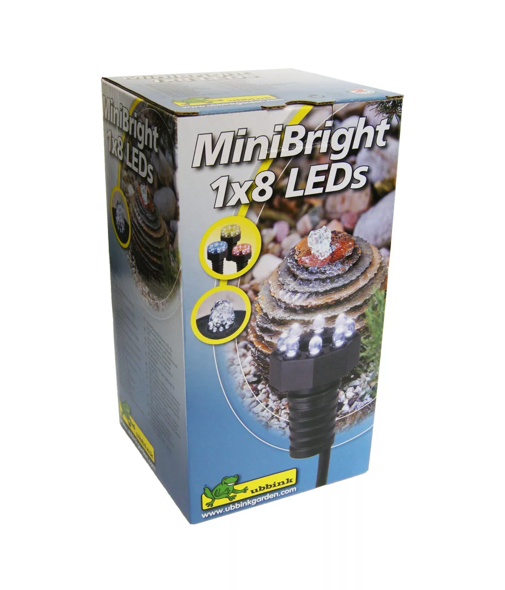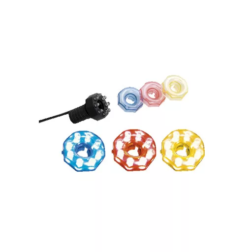 Mini projektor tószökőkutakhoz (IP68, III. osztály) LED-égővel (gyűrűvel), nyolc 1 wattos LED-del, amely egy 1,5 méteres kábellel csatlakozik. A három kábel egy háromutas csatlakozóhoz kapcsolódik, amely egy 3,5 méteres kábellel csatlakozik a transzformátorhoz. A következőkkel együtt kapható: