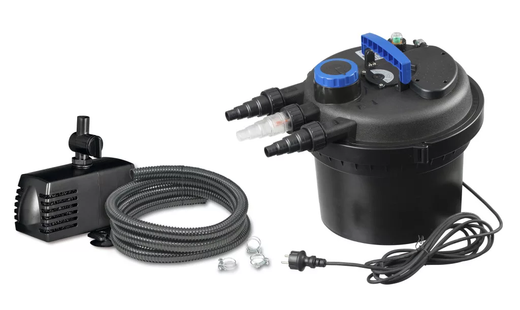 A szett tartalmazza a szivattyút és a beépített UVC egységet is, így komplett megoldást kínál a tó tisztán tartására.