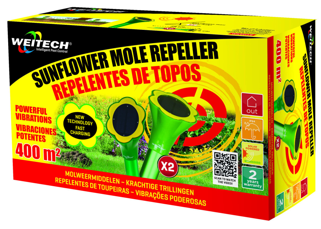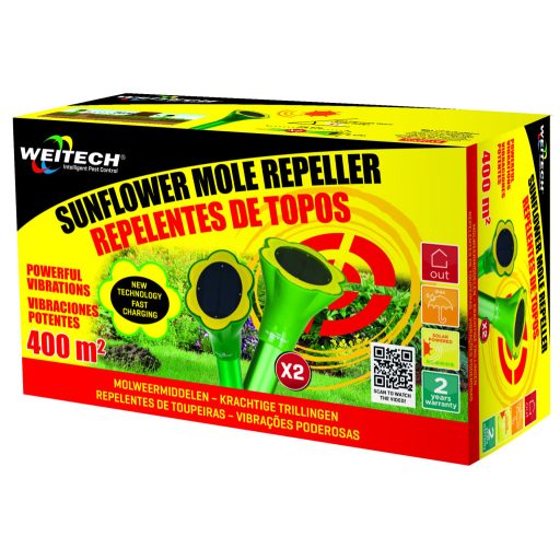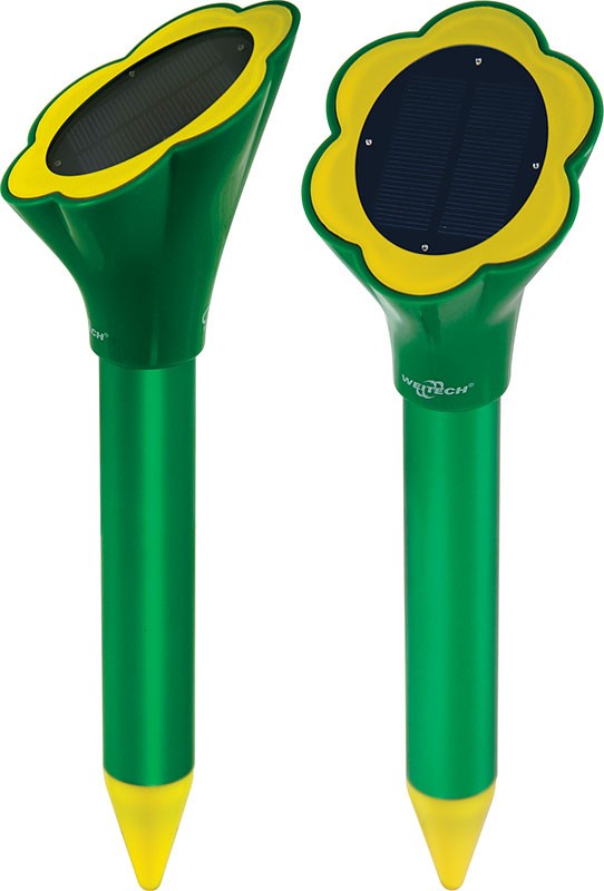 Ez a virágformájú, napelemes vakondriasztó készülék napenergiával működik; hanghullámokat és rezgéseket használ a kártékony rágcsálók (vakondfélék, stb.) távol tartására. A hanghullámok irritálják őket, veszélyérzetet keltenek és a hatóterület elhagyására kényszerítik őket. A készülék 30 másodpercenként, 3 másodpercig, olyan hangjelet bocsát ki, amely rezgéseket kelt a talajban.