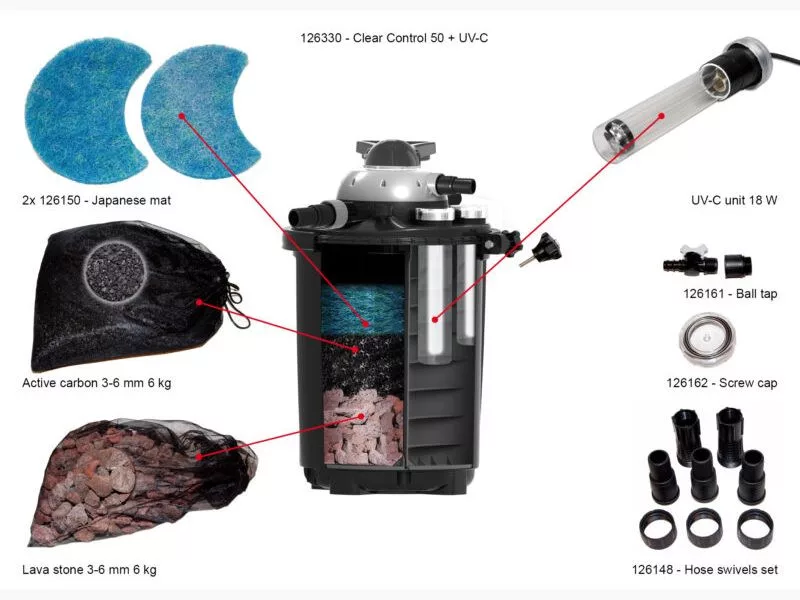 A Clear Control nyomásszűrő nagyobb kapacitású változata ideális választás közepes és nagyobb kerti tavakhoz. A rendszer folyamatos működés mellett biztosítja a tiszta, egészséges vízkörnyezetet, így a tó élőlényei optimális körülmények között fejlődhetnek.