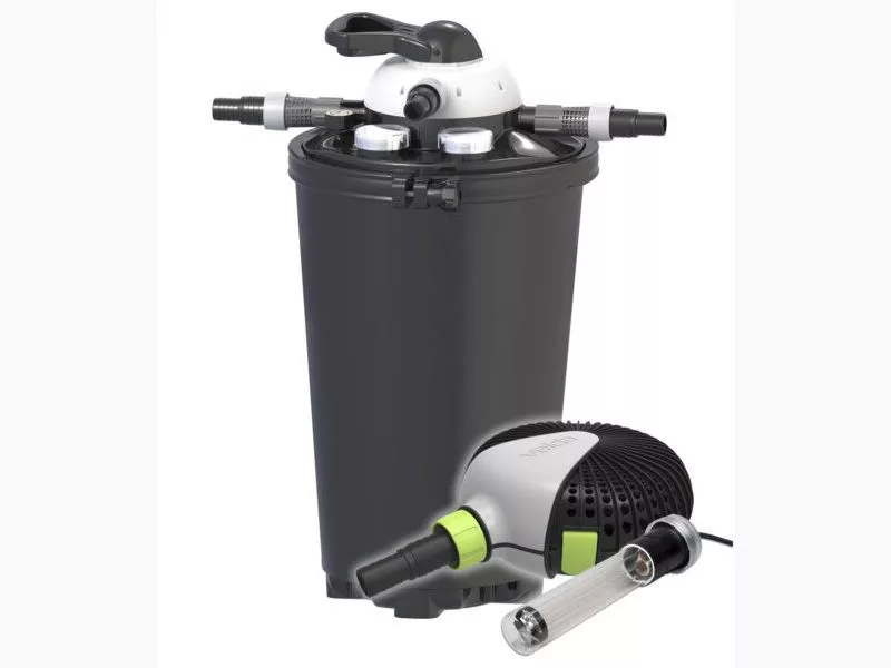 A szett tartalmazza a szükséges szivattyút és UVC egységet is, így komplett megoldást kínál a tó tisztán tartására.