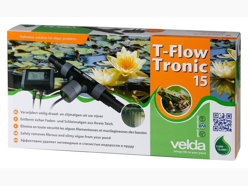 A Velda T-Flow Tronic fonalasalga eltávolító egy forradalmian új rendszer, amely a halak és növények számára biztonságos módon távolítja el mind a fonalas algákat, mind a békanyálat a kerti tavadból. A fonalas algák eltávolításához és a növekedésük megállításához szükséges rézionok koncentrációja 0,2 és 0,3 ppm között van. Ez egy teljesen biztonságos koncentráció az emberek, állatok és növények számára. Összehasonlításképpen, az európai ivóvíz-szabványok szerint 2 ppm a megengedett maximális szint az ivóvízben. A T-Flow Tronic használatának pozitív mellékhatása, hogy a tó vize egészséges lesz, és semleges, friss illatot áraszt.
