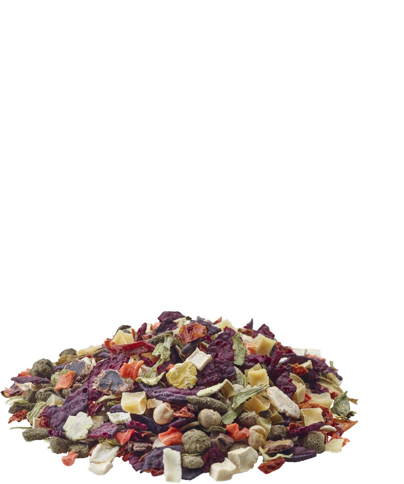 zöldségek (paszternák 9%, sárgarépa 8%, póréhagyma 4%), gyümölcsök, növényi eredetű származékok, magvak, növényi fehérjekivonatok, ásványi anyagok, olajok és zsírok, FOS, körömvirág, MOS, algák, jukka