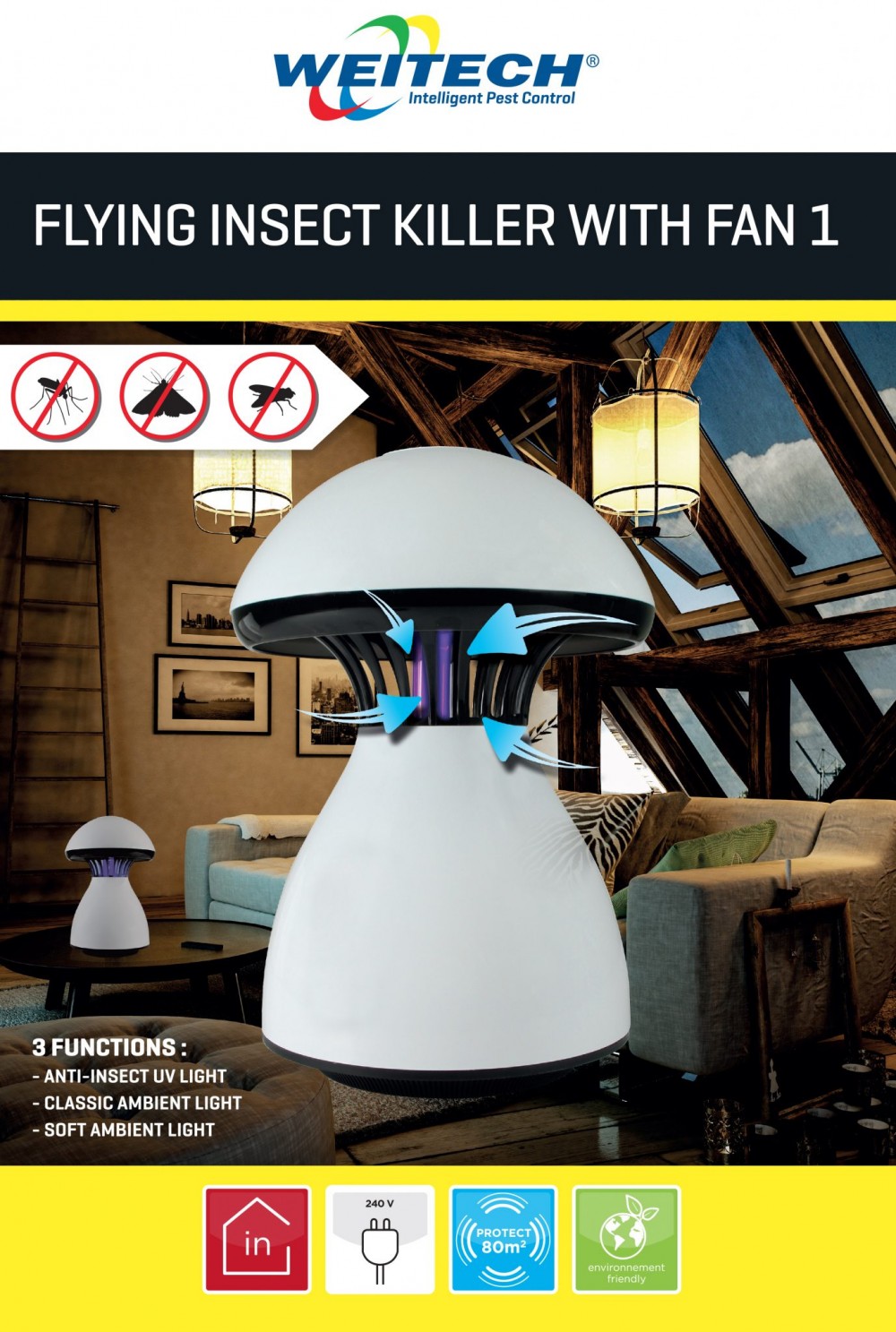 A készülék megvédi a belső tereket, beleértve a hálószobákat és a nappali helyiségeket is, a repülő rovaroktól, mint például a szúnyogok, tigrisszúnyogok, lepkék, legyek stb.