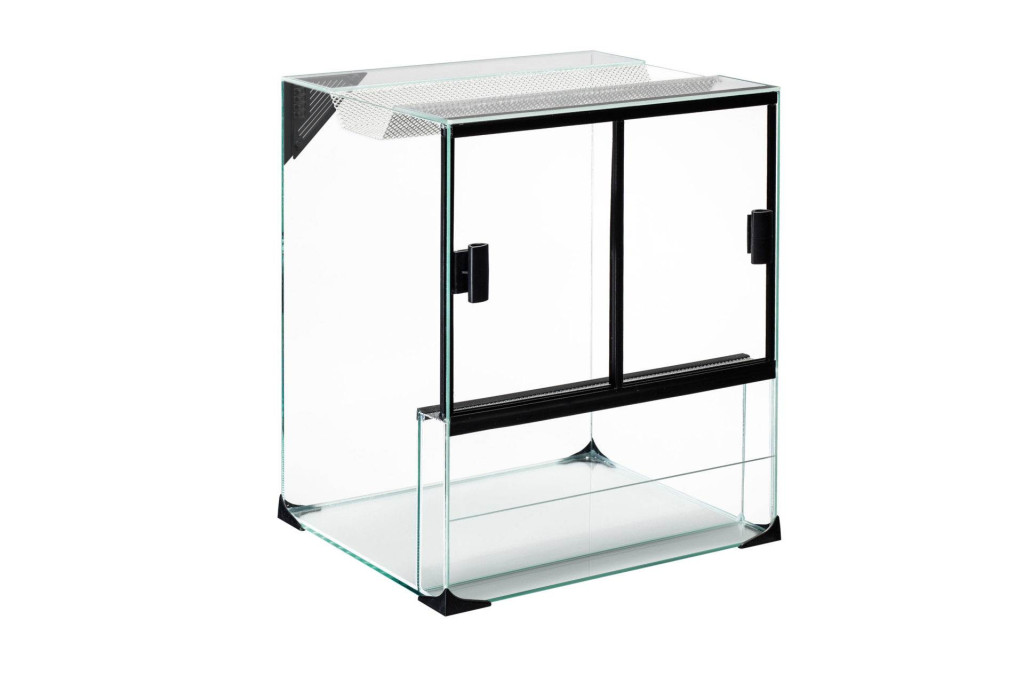 - üveg terrárium tolóajtóval, hátsó kivezetőnyílással a vezetékek számára, dupla szellőzőrács